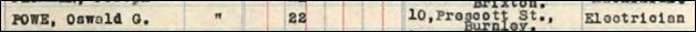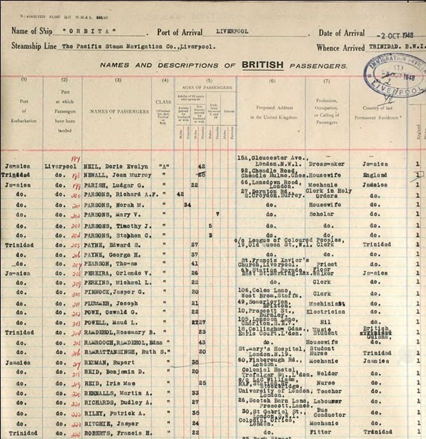 The "SS Orbita", registered to The Pacific Steam Navigation Co., sailed to Jamaica from Trinidad, and on to Liverpool, arriving on October 2, 1948. The passenger list shows that Powe, Oswald G. embarked in Jamaica and landed in Liverpool. He was allocated Class “A”, that is, over 21. He was aged 22 and his proposed address in the United Kingdom was 10 Prescott Street, Burnley. His 'profession, occupation, or calling' was as an electrician. The 'country of his last permanent residence' was Jamaica, and the 'country of intended further residence' was England.
